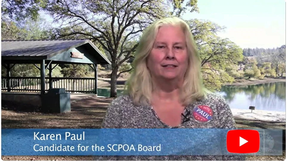 The people whom I have met in the community are unique individuals and all have different backgrounds and experiences and have a lot to give to the community. I will continue to support our community, and all organizations in it, and look into ways to help the board regardless of the outcome of this election. Finally, my husband and I moved to this community for our retirement and to be closer to our son, who lives in Sacramento. We enjoy outdoor activities like gardening, hiking, fishing, and playing with our two dogs. We have met a lot of neighbors since moving here and I am looking forward to meeting even more. Please vote for me in this election and bring the board closer to the entire community. You can reach out to me with any questions at any time by email (Kpaulscpoa@gmail.com ) or phone, at 530-852-1743. I look forward to talking to every member of the community. Thank you for your time! Karen Paul