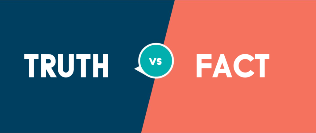 Truth is entirely different; it may include fact, but it can also include false narratives and beliefs. Oftentimes, people will accept things as true because they fall closer to their comfort zones, are assimilated easily, or reflect their preconceived notions of reality.