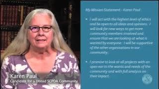 ![]() | Karen Paul’s Campaign Pledge Karen Paul, candidate for the SCPOA board of directors, pledges to unite the community by always striving to act in the best interest of all the members. 1:43 | https://youtu.be/nNmjGtPeVDk |